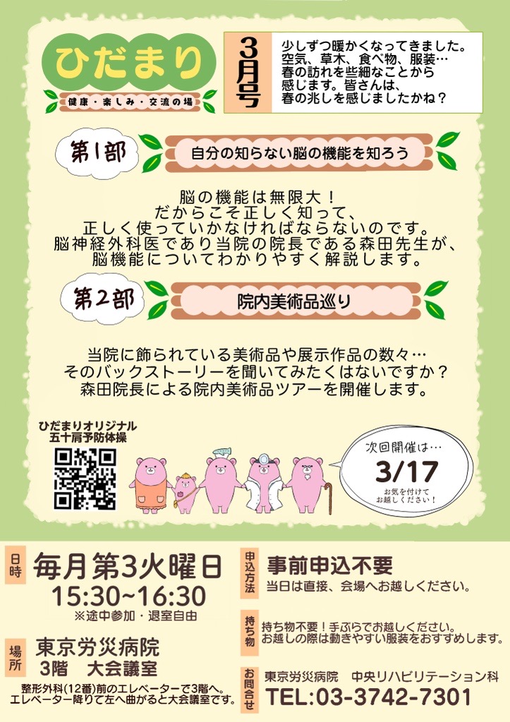 3月17日(火)の第11回目は今年度最後のひだまりです。 1部では当院院長による脳の機能についてのお話です。2部では院長による院内の美術品巡りを行います。まだ知られざる東京労災病院を是非この機会に知ってもらえると嬉しいです。
