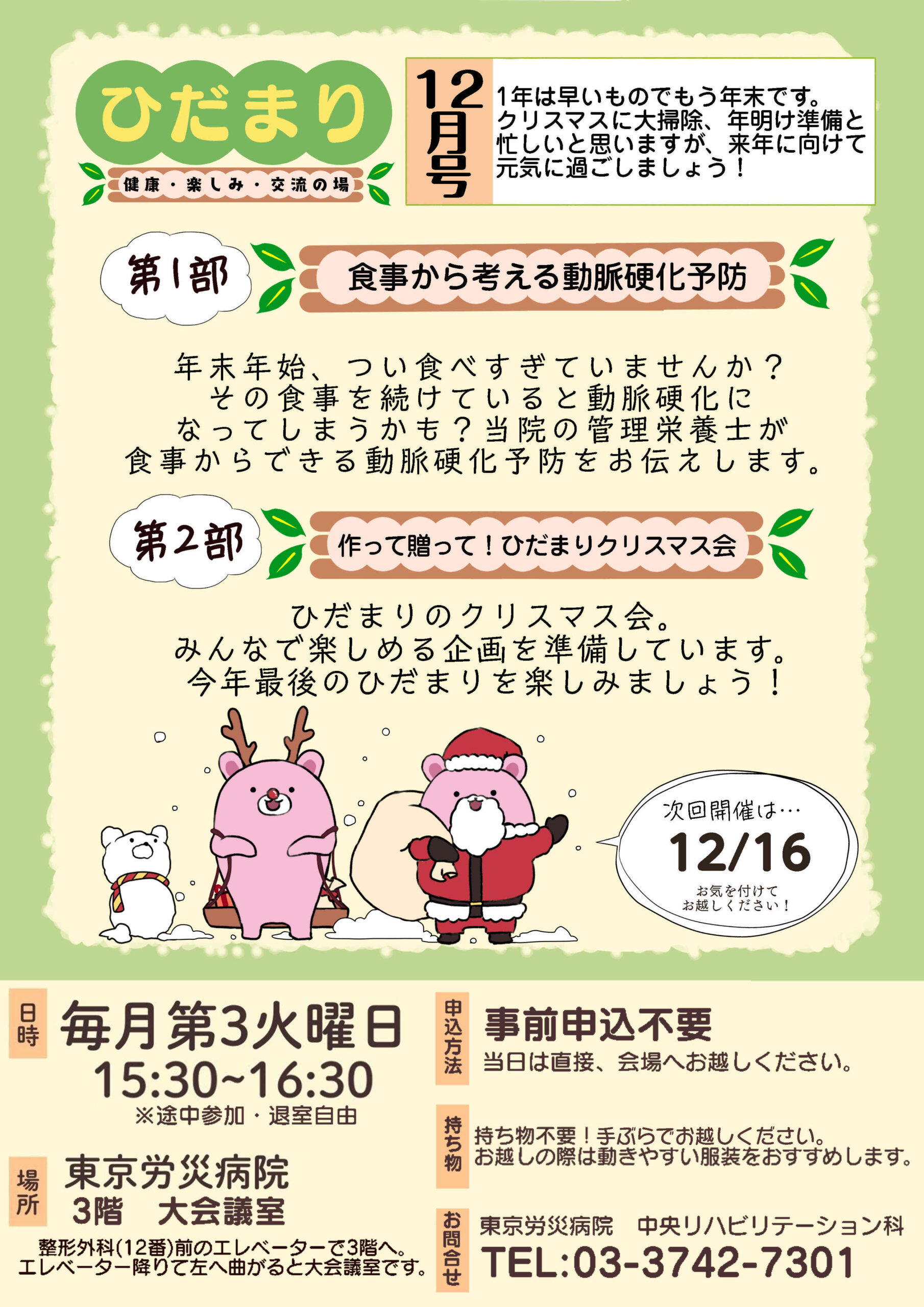 12月16日(火)の第8回目は「食事から考える動脈硬化予防」「作って贈って!ひだまりクリスマス会」です。是非、皆様お越しください。